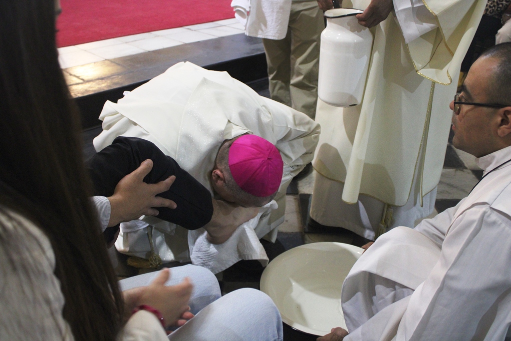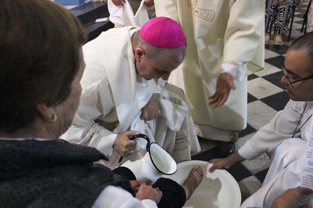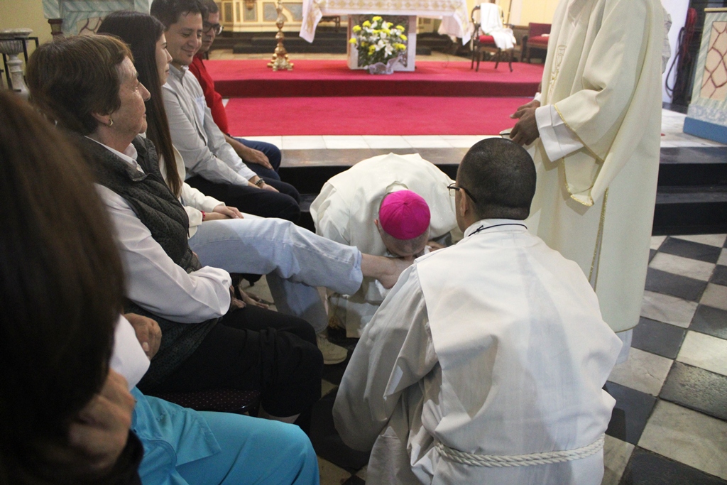 Luego el obispo realizó el rito de lavado de pies a doce hombres y mujeres de la comunidad, momento de especial recogimiento, acompañado del coro.