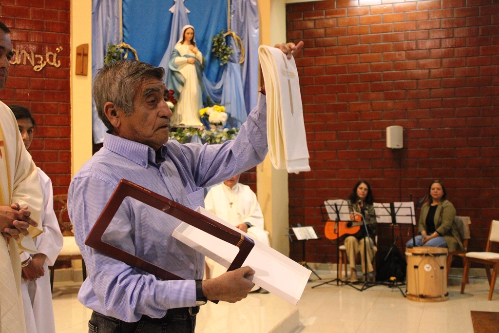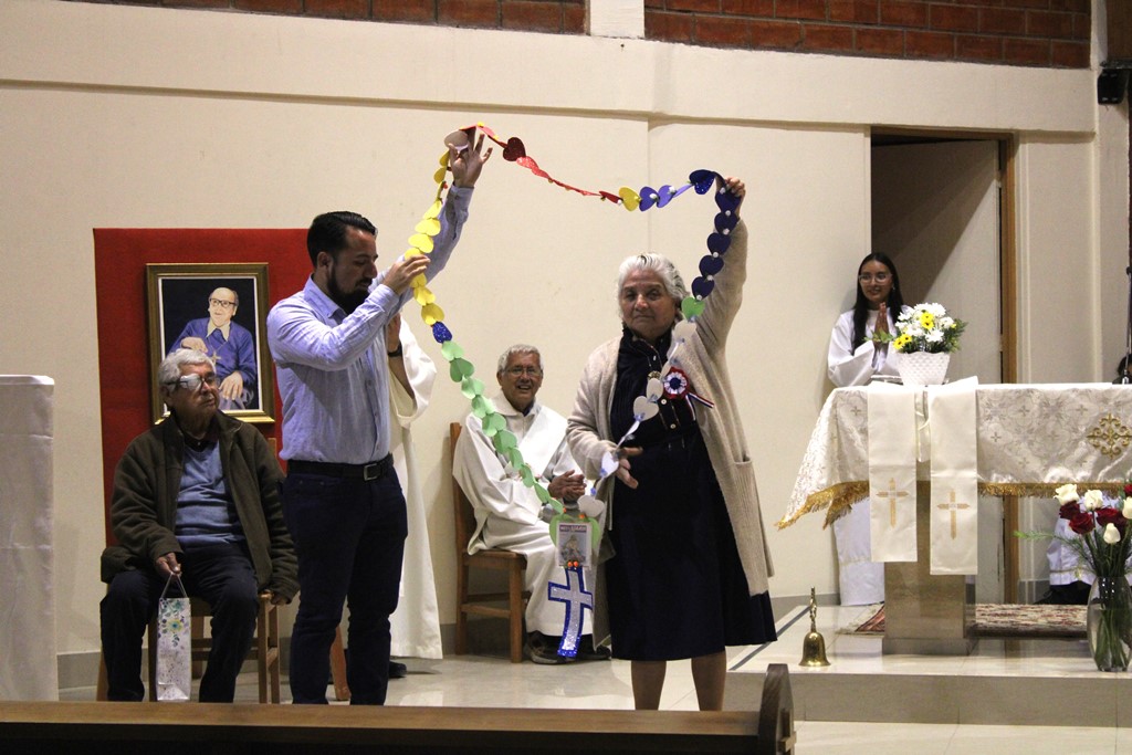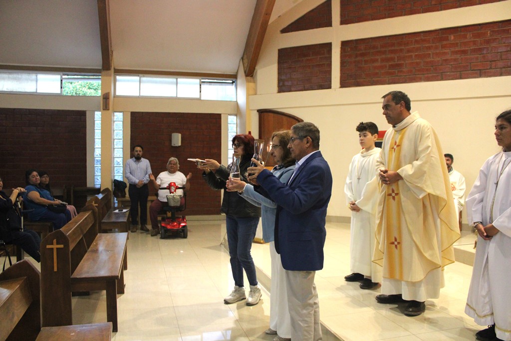 En el ofertorio, junto al pan y al vino se llevó al altar un dibujo del obispo Fernando Ariztía, y una estola. Y al final, la acólita Vanesa Robles a nombre de la comunidad, agradeció al Señor el ministerio del padre Jaime, su entrega y su amor por la Iglesia. Para terminar, la señora María Orellana, de la parroquia Santa Cruz, recitó un poema al p. Jaime y le regaló un rosario, hecho por sus propias manos.